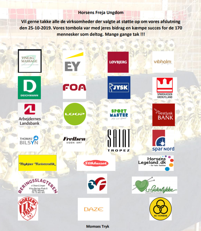 Horsens Freja Ungdom vil gerne takke alle de virksomheder, der valgte at støtte op om vores afslutning den 25-10-2019. Vores tombola var med Jeres bidrag en kæmpe succes for de 170 mennesker som deltog.
